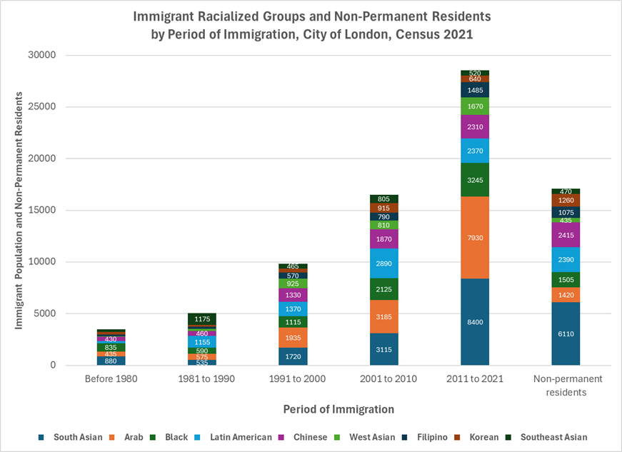 Of the 103,295 immigrants living in London, 66,305 identify as racialised, a clear majority. This growth has been robust in recent decades. South Asian and Arab populations have shown the most notable increases, with the number of South Asian immigrants rising from 3,115 in 2001–2010 to 8,400 in the most recent period, 2011–2021. Arab immigration followed a similar trend, reaching 7,930 in that same period.